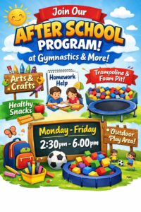 Gymnastics & More offers monthly for the after-school program that we proudly call “Tutor & Play.” The Ocean Drive Elementary school bus will bring your child straight to the gym from school. Once they get there, they get playtime in the gym and a great snack. Following that, its homework-time (with tutoring, if needed), game-time, movie-time or crafts until you pick them up by 6pm. Add a gymnastics, cheer or tumbling class to “Tutor & Play”, then when you pick up your child, they will already have had their playtime, snack, extracurricular activity and their homework completed. When you get home, it can be quality family time!
